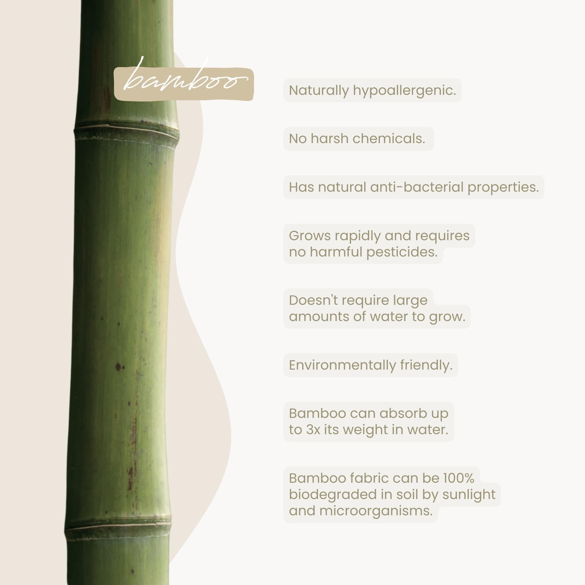• Bamboo: Unbleached 100% bamboo back sheet films, all-natural and 100% compostable
