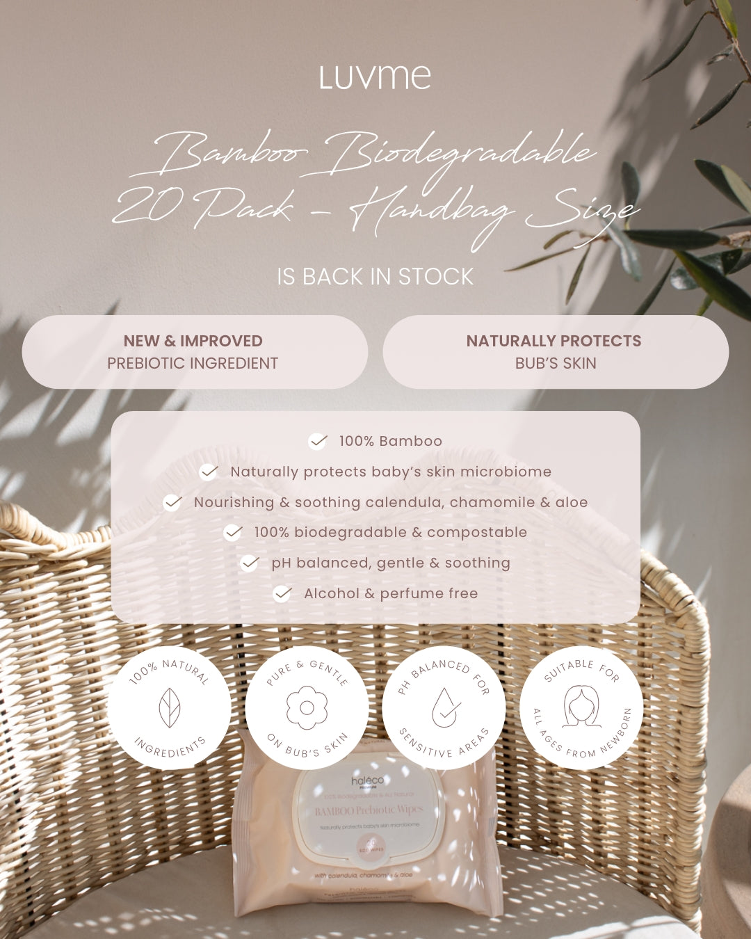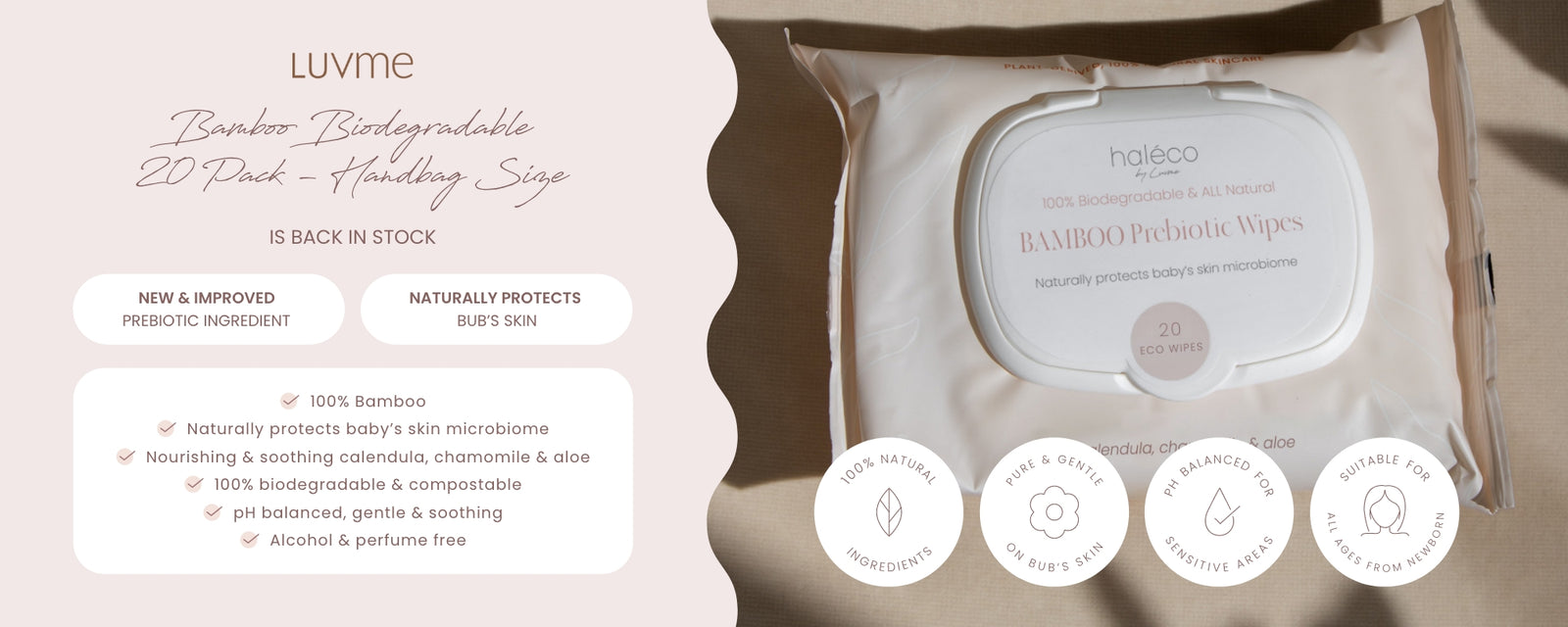 Meet Haléco by Luvme Bamboo Prebiotic Wipes - a soft, soothing wipe designed for delicate skin. Made from 100% bamboo fibre and packed with calming botanicals, these wipes help cleanse, hydrate, and support the skin’s natural balance.